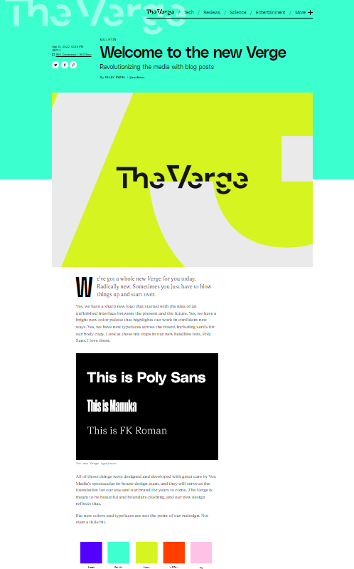 Once the name for this site had been chosen, I needed to find a design or theme that I liked. I must admit that seeing the recent redesign of the Verge, with its emphasis on a home feed and more blog-like posts, had a huge influence on my colour palette. My blog name could even be considered a nod to the impact the redesign had on my own site, as I settled on it after reading about the updated look to their site. I still have work to do to get the site where I want it, but at least it’s a start.